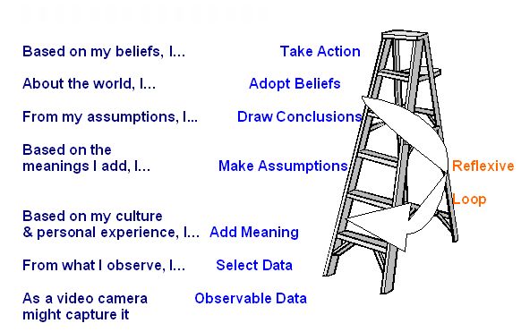Figure 3: The Ladder of Inference ![]() In any given environment, there is more to observe than the human mind can capture. Imagine a video camera recording a scene, and notice how much more the camera might see compared a human in the same environment. Each of us selects which environmental data we will focus on, and what we will attend to. Once our mind has selected the data we find relevant, we will begin to add meaning to that data based on our personal experience and acculturation. Based on the meaning we perceive, we make assumptions, which lead us to draw conclusions about the world. Our conclusions cause us to adopt beliefs about the world. The actions we take are based on our beliefs. [QN.No.#8. The model entitled The Ladder of Inference shows that...] Let’s look at how the Ladder of Inference might play out if a person from wealth class, middle class, and poverty class were all present in the same circumstance. Each of the three people arrives at a hospital to visit an elderly loved one. Upon entering the loved one’s room, they notice that the person they are visiting has a bruise on their arm. The person from wealth class might notice the bruise and decide that someone has injured their loved one. They assume that the injury has been caused by the carelessness of the nursing staff. Drawing the conclusion that the staff is inept, they may adopt the belief that their loved one isn’t safe in the facility and take the action of moving the person to another facility. A person from the middle class might see the bruise and decide that their loved one has had an accident. They decide that the injury occurred due to a fall or a bump. They assume that the nursing staff is competent, but stretched to thin to observe the patient closely, and that their loved one is growing too weak to move about on their own, and draw the conclusion that the loved one needs assistance to ambulate. They adopt the belief that it is time to procure a walker for their loved one and ask the staff to order a walker for the patient. A person from poverty class might see the bruise and decide that their loved one was assaulted by his/her roommate. They assume the injury occurred while the roommate was attempting to steal their loved one’s watch. They draw the conclusion that their loved one is being victimized by his/her roommate, and adopt the belief that the loved one is unsafe with the current roommate. They insist upon talking to the head nurse to expedite the transfer of their loved one to a room on a different floor of the facility. The ladders of these three people are all drawn from different paradigms. Paradigms develop due the reflexive loop. After being acculturated to make assumptions and draw conclusions by habitually viewing matters through their programmed cultural lenses, those steps are skipped in future analysis of a situation. They respond reflexively in much the same manner to every future situation that is similar to what they have experienced in the past. Thusly, people from different social classes learn to view the world in very different ways. Does the Middle Class Exploit and Oppress the Poor?One might argue that the rich oppress the middle class by levying taxes that include loopholes for the wealthy, and by introducing them to schemes where the rich person makes far more money than the middle class middle-man. Stories abound about people who have won the lottery only to see their money dissipate rapidly as those in wealth class sell them overpriced objects, or set them up with faulty investments. It appears that the rich like to protect the exclusivity of their class, and are skilled at doing so.