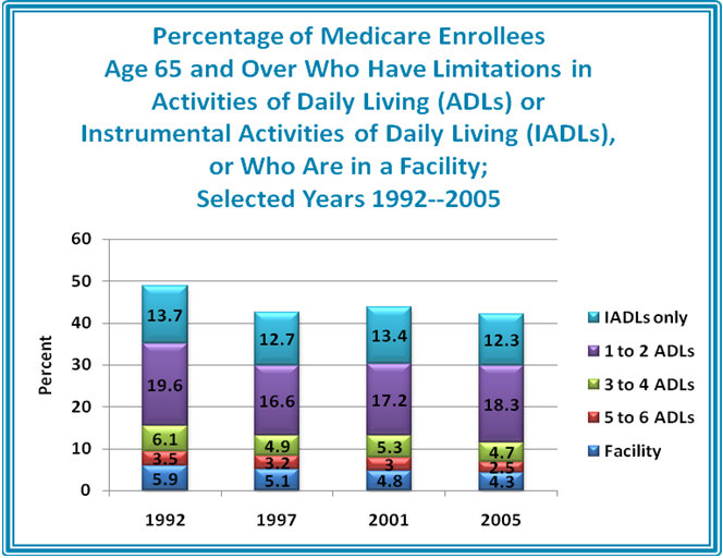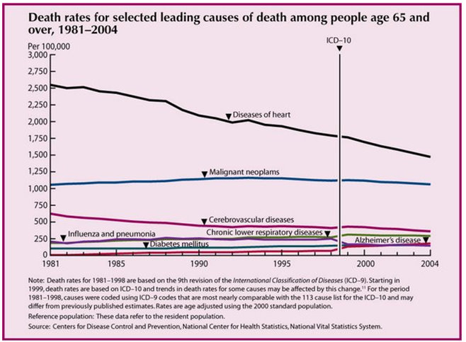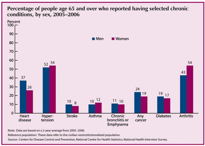 Chronic disease, other illness, or injuries may limit physical and mental abilities. There are important limitations for work and retirement policies, health and long-term care needs, and the social well-being of the elderly that are impacted by changes in functional limitations. The chart below shows what percentages of Medicare enrollees have these impactive limitations. ![]() Six of seven leading causes of death among older Americans are chronic diseases---long-term illnesses that are seldom cured. These conditions adversely affect quality of life and contribute in a major way to worsening functionality and the inability to maintain independence (Federal Interagency Forum 2008, 27). ![]() Age-Related DiseasesAlthough no disease is limited to the elderly, there are some that are predominantly age-related. Basic, clinical, and epidemiologic research is performed daily to develop creative, safe, and productive ways to prevent and treat age-related diseases, disorders, and disabilities (NIH 2009b). The goals of these studies are to: