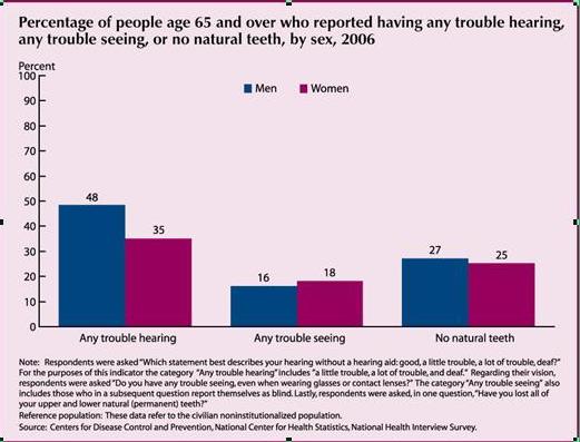 [QN.No.#1.The most common causes of vision loss among the elderly are:] Signals of vision loss in the elderly include blurred vision, image distortion, difficulty reading, decreased night vision and visual field loss. Slower adaptation when moving from sunlight to indoors or change of focus between closer objects and those more distant are also vision problems. Sensitivity to glare and decline in peripheral vision greatly affect the ability to drive (Life Alarm 2009). Vision loss can affect many previously enjoyed activities, such as reading, watching television, and attending the theater or sporting events. Depending on the severity of the vision trouble, it can also impede facial recognition, transportation issues (reading street signs or various public transportation signs), as well as communication---especially non-verbal cues. Regular visual check-ups are needed to catch the problems early on when there is the best chance of correcting them. HearingAs we age hearing often declines. Difficulty with hearing can be especially frustrating to both the elderly and to those around them. The ability to hear impacts speaking as well as equilibrium, so a person who has trouble hearing may also have difficulty speaking, or feel off balance or dizzy. In a national survey of people 65+, 48% of men and 35% of women reported having trouble hearing (Federal Interagency Forum 2008, 28). This can result in difficult social situations. Some say, "As you lose hearing you lose people." In social gatherings it is difficult to stay engaged in conversations when not all the comments are heard. Frustration over not being able to hear comments can produce anger displaced on those who are speaking. Communication becomes more laborious and, after time, avoidance of communication can occur. A famous audiologist, Mark Ross, once said, "When someone in the family has a hearing loss, the entire family has a hearing problem” (Kricos, n.d.). That is very accurate, because it affects every member of the family, not just the person who’s hard of hearing. Basic learned hand gestures used between the hearing impaired and loved ones can help increase communication. This may vary from levels of deaf sign language to just basic "homemade" gestures that are shared and understood for communication. Since a great majority of communication is non-verbal, there is still much that can be communicated, especially with those familiar with the hearing impaired. "Communication in general is a process of sending and receiving messages that enables humans to share knowledge, attitudes, and skills. Although we usually identify communication with speech, communication is composed of two dimensions---verbal and nonverbal. "Nonverbal communication has been defined as communication without words. It includes apparent behaviors such as facial expressions, eyes, touching, and tone of voice, as well as less obvious messages such as dress, posture and spatial distance between two or more people" (Fort Hayes, n.d.). Some who have lost hearing find comfort in the ability to communicate and interact with people through e-mailing and Internet message boards. This provides opportunity to exchange ideas and communicate without the usual frustrations. Because of the more recent access to computers, many of the elderly have avoided its use. The healthcare professional can help elderly clients overcome their fear or indifference by showing them basic steps of communication over a computer. Of course, this does not supplant emotionally important personal interactions, but it can provide a feeling of competence and satisfaction lost in face-to-face interactions. ![]() Edentulousness: Loss of TeethThe same survey that inquired regarding older persons' sight and hearing also surveyed to find how many are affected by the loss of teeth. The respondents were asked if they had lost all of their upper and lower teeth. Twenty-seven percent of men and twenty-five percent of women reported having no natural teeth (Federal Interagency Forum 2008, 101). Obviously, periodontal disease and tooth decay, with the complication of loss of teeth, are major health concerns for the elderly population. However, the majority of the cases of edentulousness have no apparent reason, no underlying cause or origin, other than a symptom of the aging process (Cadena 2008). In a six-year study, it was shown that edentulous elderly in nursing homes who had no dentures had a significant deterioration of their systemic health compared to those who had twenty or more teeth. Their mortality rate was also decidedly higher. At least a major reason from this is that the loss of teeth is known to influence the mastication of foods, endangering nutritional status (Shimazaki et al 2001). ![]() Tooth loss has also been identified as a significant risk factor for head and neck, esophageal, and lung cancers. Efforts to preserve the teeth may decrease the risk of these cancers (Hiraki et al 2008). [QN.No.#2.Efforts to preserve the teeth may decrease the risk of:] Another study, using self-assessed chewing ability rather than number of teeth, found that the 80-year-old subjects able to chew four foods or less ranged from 2-7 times more dissatisfied with their social interactions, physical condition, meals, and daily living (Takata et al 2006). Apparently the functional and psychological problems can be offset to some extent if the way the elderly person looks can be satisfactorily improved. A group of elderly who were studied were interested in surgical, restorative, and rehabilitation procedures, to the detriment of preventive actions and promotion of health. This suggests that there needs to be plans to educate the elderly client in the essentiality of oral health (Unfer et al 2006). Technological advances in dentistry have benefitted the elderly. The elderly have even better results with oral implants than younger individuals (Bryant 2005). However, some seniors may need to be reminded that ha
