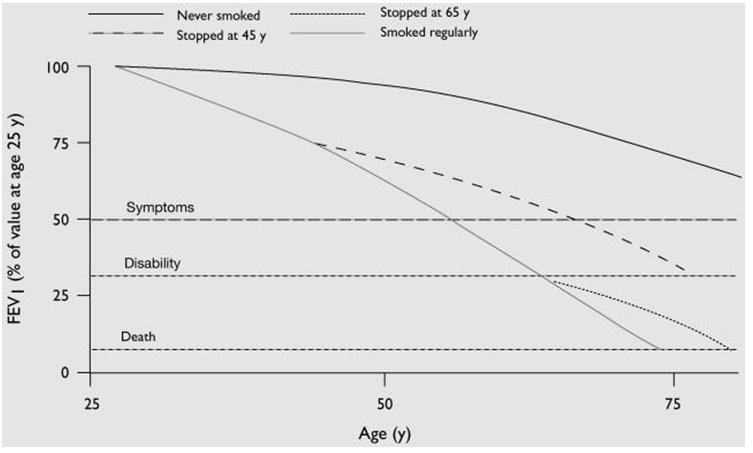 Although stopping or decreasing the amount of smoking will not promote recovery of lost lung function, it does reduce the rate of decline in the ratio Forced Expiratory Volume (FEV) (the amount of air that a person can forcibly blow out in one second, measured in liters) to Forced Vital Capacity (FVC) (the total amount of air that can forcibly be blown out after full inspiration, measured in liters). ![]() Changes in lung function after age 25 in smokers, nonsmokers, and ex-smokers, based on FEV1 (forced expiratory volume in 1 second). (Doherty and Briggs 2004) "Early diagnosis by spirometry is essential since patients at risk may dismiss telltale symptoms as the normal consequences of smoking. Prompt initiation of smoking cessation therapy can help improve airflow, partially reverse impaired lung function, slow the accelerated annual decline of FEV1 caused by tobacco smoke, and reduce the premature morbidity and mortality associated with COPD and other tobacco-related diseases. Initiation of appropriate interventions earlier rather than later, especially bronchodilator therapy, can improve symptoms, quality of life, and exercise capacity while decreasing the acute exacerbation rate and perhaps help to slow the progressive accelerated decline in lung function at minimal cost" (Doherty and Briggs 2004). Oncology in the AgingThe most important risk factor for cancer is aging. The occurrence of common malignancies increases with age; more than 60% of all carcinomas occur in those aged 65 or older and is expected to increase to 70% by 2030 (Balducci and Beghé 2008).