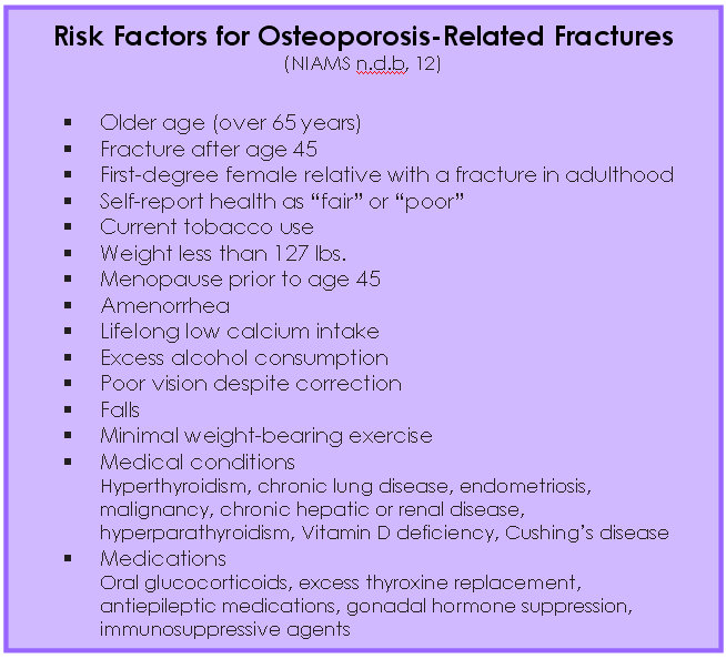 OsteoporosisOsteoporosis is a disease manifested by a decrease in bone strength; this leads to a greater risk of fractures, or broken bones (NIAMS n.d.b, 1). Osteoporosis is the primary underlying cause of fractures in postmenopausal women and the elderly. Bones of the hip, spine, and wrist more frequently sustain fractures, but any bone can be affected. Some fractures can be permanently crippling, especially if they are in the hip. [QN.No.#12.The primary underlying cause of fractures in postmenopausal women and the elderly is:] ![]() The first plan of attack is to aid your clients in preventing osteoporosis. The following are some of the ways an individual can help prevent and/or treat osteoporosis (NIAMS n.d.b, 17ff, 32ff):