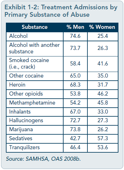 [Question #10. The most common illicit drug used is :?] [Question #11. The substance used more frequently and in greater quantities is :] Perhaps reflecting these differences in use,American men are two to five times more likely to develop a substance use disorder than women (Brady and Randall 1999; Johnson and Glassman 1998; SAMHSA 2008;SAMHSA, OAS 2004a). In fact, in developed nations around the world, men experience greater mortality and morbidity from alcohol and tobacco use than women, due in part to greater rates of use (Lopez 2004). Worldwide,the health burden for substance use disorders is more than three times greater for men than women (World Health Organization 2004).The economic cost of men’s substance abuse is greater as well; men who abuse substances have more criminal justice system involvement than women who abuse substances, and because men are more likely to have jobs, they more often require disability payments (Harwood et al. 1998; Oggins et al. 2001; Timko etal. 2009). When men receive substance abuse treatment, taxpayers benefit: For every dollar spent on treatment, an estimated $9.00 is saved in criminal justice, healthcare, welfare,and disability costs (Harwood et al. 1998). Given the chance, men and women are equally as likely to use substances. However, men may be more likely than women to use and abuse them largely because they have more opportunities to do so (van Etten et al. 1999). This could, in part, account for higher rates of abuse and dependence among men. Men also generally begin using alcohol and drugs at an earlier age than women (SAMHSA 2005). Understanding how socially constructed gender role expectations affect some men’s choice of substances and attitudes toward treatment can help behavioral health service providers choose more effective strategies. Alcohol consumption, in particular, can be tied to ideas about masculinity and appropriately masculine activities. For young men, a first drink or first episode of drunkenness is often a rite of passage (Blazina and Watkins 1996; Hunt et al.2005), and drinking is commonly seen as a form of male bonding (West 2001). Such traditional ideas linking masculinity to drinking are prevalent across cultures (Heath 2000) and are associated with greater alcohol consumption among college men (Blazina and Watkins1996; West 2001) and military person-nel/veterans (Burda et al. 1992; West 2001). Men also respond differently than women to certain substances, and some substances have effects in men that they do not have in women(see Chapter 3). For example, when men and women think about cocaine cravings, their neural responses differ (Kilts et al. 2004); men who use cocaine are also more likely than women to state that cocaine increases their sex drive and that they have more sex when using cocaine (Washton 2009). Findings such as these suggest the possible usefulness of gender-specific treatment approaches for cocaine dependence and other substances of abuse. As with cocaine, there are differences between the sexes in both methamphetamine and opioid dependence. Men show greater loss of mental faculties relating to executive function and memory than women, and these effects persist even after abstinence (Ersche et al. 2006). Men may use or start to abuse substances for different reasons than women, and male institutions (e.g., fraternities, amateur sports teams) often encourage alcohol use (Brooks 2001). Men who cannot talk about their feelings or manage them constructively sometimes use substances to deal with difficult emotions. Shame, especially, can limit help-seeking behaviors for substance use and mental disorders (Brooks 2001; Pollack 1998b). ![]() ![]() SAMHSA’s 2008 NSDUH established rates of lifetime use of substances for men and women (Exhibit 1-1); it found that 12 percent of menages 18 and older met criteria for a substance use disorder in the past year compared with 6.3 percent of women (SAMHSA 2009). SAMHSA’s 2006 Treatment Episode DataSet (SAMHSA, OAS 2008b) revealed differences in substance abuse patterns and preferred substances of abuse between men and women who entered substance abuse treatment programs funded through State agencies (Exhibit 1-2). For all drugs listed save sedatives and tranquilizers, most treatment-seekers were male. However, data reported in the exhibit are for the primary substance of abuse,which was not necessarily the only substance a person abused. State of the FieldSubstance abuse treatment was designed for a largely male client population, and greater numbers of men than women continue to be treated in a variety of behavioral health settings.Additionally, much of the research on substance abuse treatment has been conducted with male participants; nevertheless, it has not examined the specific, unique issues of men (e.g., their health, psychological, cultural, and social needs)as related to substance abuse and its treatment. There is a difference between designing a substance abuse treatment intervention for a population—the majority of whom are men—and designing one specifically to address factors that distinguish male from female clients.The study of men’s issues is a growing field, and as researchers focus on issues specific to men, our knowledge base—and thus our ability to design treatment interventions for men—will increase.