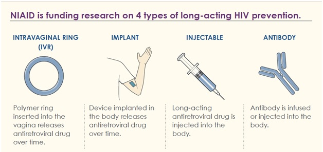 What Are Long-acting HIV Prevention Tools? Long-acting HIV prevention tools are new long-lasting forms of HIV prevention being studied by researchers. These are HIV prevention tools that can be inserted, injected, infused, or implanted in a person's body from once a month to once a year to provide sustained protection from acquiring HIV. These products are not available now, but they might be in the not-too-distant future. Why Are Long-acting HIV Prevention Tools Needed?Currently, people who are HIV-negative but at very high risk for HIV can lower their chances of getting HIV by taking a pill that contains two anti-HIV drugs every day. This is called pre-exposure prophylaxis (PrEP). When taken daily, PrEP can stop HIV from taking hold and spreading throughout your body. PrEP is highly effective when taken daily as prescribed. However, studies have shown that PrEP is much less effective if it is not taken consistently, and that taking a daily pill can be challenging for some people. That's why researchers are working to create new HIV prevention tools that do not require taking a daily pill. Scientists funded by the National Institutes of Health (NIH) are developing and testing several long-acting forms of HIV prevention that can be inserted, injected, infused, or implanted in a person's body from once a month to once a year. The goal of this research is to provide people with a variety of acceptable, discreet, and convenient choices for highly effective HIV prevention. None of the research on these possible HIV prevention options has been completed, so they are not yet approved by the FDA and are not available for use outside of a clinical trial. What Types of Long-acting HIV Prevention Tools Are Under Study?Four types of long-acting HIV prevention are in design and testing in research studies: intravaginal rings, injectable drugs, implants, and antibodies. ![]() NIH National Institute of Allergy and Infectious Diseases: Long-Acting Forms of HIV Prevention Intravaginal rings for women. Long-acting intravaginal rings are polymer-based products that are inserted into the vagina, where they release release one or more anti-HIV (or antiretroviral) drugs over time. The intravaginal ring at the most advanced stage of research is the dapivirine ring, which was tested in two large clinical trials including the NIH-funded ASPIRE study. The dapivirine ring is undergoing further evaluation in the HOPE open-label extension trial. Injectables. Long-acting injectables are select long-acting antiretroviral drugs that are injected into the body. Injectables are being studied for both HIV prevention and HIV treatment. The first large-scale clinical trial of a long-acting injectable for HIV prevention began in December 2016. Called HPTN 083, the NIH-sponsored study—a partnership with ViiV Healthcare and the Bill & Melinda Gates Foundation—is examining whether a long-acting form of the investigational antiretroviral drug cabotegravir, injected once every 8 weeks, can safely protect men and transgender women from HIV infection at least as well as daily PrEP. Results are expected in 2021. A related study called HPTN 084 is testing whether injectable cabotegravir safely prevents HIV infection in young women. Implants. Long-acting implants are small devices that are implanted in the body and release an anti-HIV drug at a controlled rate for continuous protection from HIV over time. NIH is funding the development and testing of several of these implants for HIV prevention. These products have not yet entered clinical trials. Studies supported by other funders are exploring an implant for women that protects users from both HIV and unplanned pregnancy. Antibodies. Scientists have begun to test whether giving people periodic infusions of powerful anti-HIV antibodies can prevent or treat HIV infection. The antibodies involved can stop a wide variety of HIV strains from infecting human cells and thus are described as “broadly neutralizing antibodies” (bNAbs). Two advanced NIH-funded clinical trials are assessing whether giving infusions of bNAbs to healthy men and women at high risk for HIV protects them from acquiring the virus. Several early-stage clinical trials of other bNAbs for HIV prevention also are underway. Can I Use Long-acting HIV Prevention Tools Now?