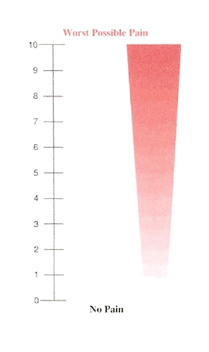 This scale is a colored stripe in which color gradually changes from white (no pain) through shades of pink to dark red (worst possible pain). The patient is asked to point to the area on the scale that shows their level of pain. To obtain a number for documentation, they physician or nurse uses the scale parallel to the color stripe to find the number corresponding to the area where the patient points.